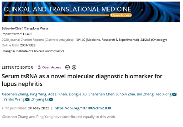 熊涛教授团队和南京鼓楼医院医学检验科李智洋研究员团队合作,在影响因子为11.492的高水平期刊Clinical and Translational Medicine上在线发表了题为《Serum tsRNA as a novel molecular diagnostic biomarker for lupus nephritis》的文章。该文分析了狼疮性肾炎(lupus nephritis, LN)血清中tsRNA的表达谱,首次筛选到LN组中显著高表达的tRF-Ala-AGC-2-M4,并对其诊断价值和分子功能进行了评估和预测。团队成员研究生张孝山和南京鼓楼医院医学检验科杨平主管技师为共同第一作者,熊涛教授为本文的第一通讯作者。
