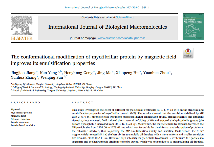 孙卫青教授课题组在国际top期刊《International Journal of Biological Macromolecules》(中科院一区,IF:7.7)发表题为“The conformational modification of myofibrillar protein by magnetic field improves its emulsification properties(磁场对肌原纤维蛋白的构象修饰改善了其乳化特性)”的论文。论文第一作者为韩国av