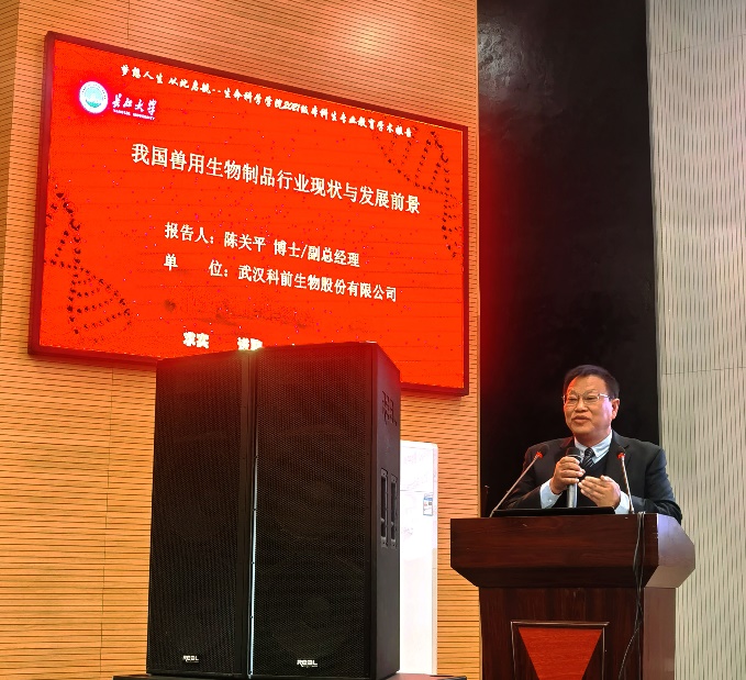 10月21日,学院邀请武汉科前生物股份有限公司副总经理陈关平博士,为2021级近300名本科生作了题为“我国兽用生物制品行业现状与发展前景”的学术报告。陈关平博士从我国兽用生物制品行业现状、行业特点、科前生物优势、未来发展等四个方面,对我国兽用生物制品行业的现状及发展前景进行了深入分析。报告提高了学生对该行业发展及人才需求的进一步认识,深受学生欢迎。