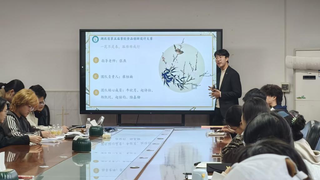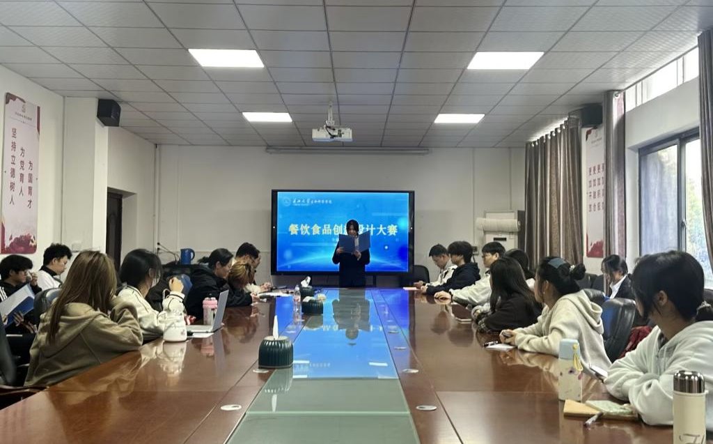 餐饮食品创新设计大赛在1教217会议室顺利举行。比赛以“食韵荆楚·创新味来”为主题,共吸引12支团队参与。经评审,最终“楚韵碧玉冻”“藕遇鱼福”等8组作品进入下一阶段。