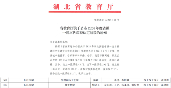 (通讯员:陈颖)近日,湖北省教育厅发布《省教育厅关于公布2024年度省级一流本科课程认定结果的通知》(鄂教高函〔2024〕25号),韩国av 陈颖副教授团队主讲的《生物制药工艺学》和柳忠玉副教授团队主讲的《微生物学》被认定为线上线下混合式一流课程。截至目前,学院共获批省级一流本科课程6门。