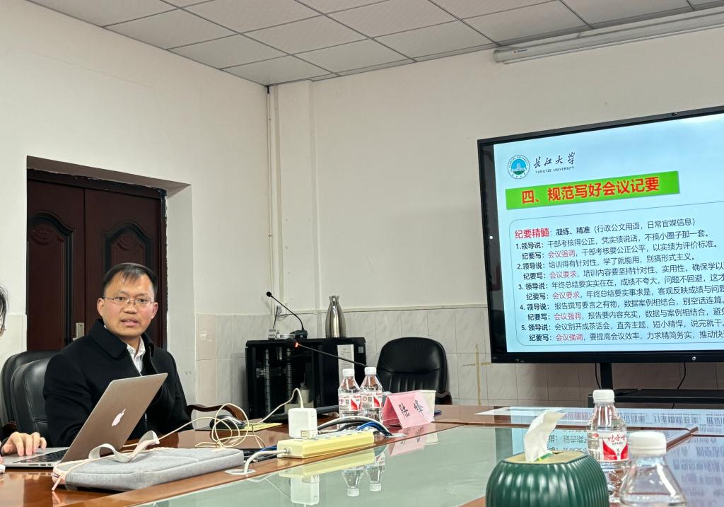 在1教217会议室开展师生干部业务能力专题培训。学院特邀校办副主任陆峰老师做《会议记录纪要规范》专题培训。学院各党支部委员会成员、各科室科长、副科长、学生骨干参加培训会。