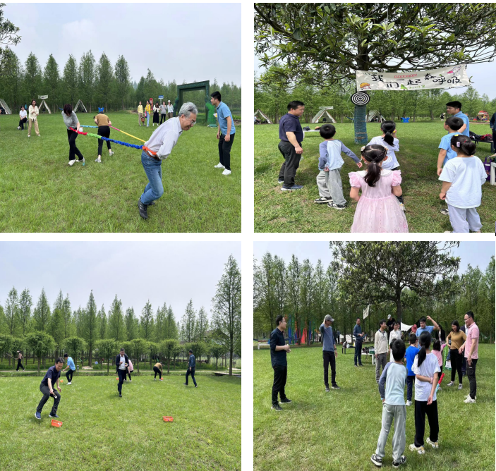 一个小时后顺利到达目的地,进入园门,路过水上休闲厅,穿过拱形栅栏走廊后,映入眼帘的便是一片郁郁葱葱的杉树林,树木不算高耸,但一颗颗笔直挺拔翠绿,衫树林中间还有一片绿意盎然的大草地,以及很多游玩项目。在欢快的音乐里,大家兴致高涨,有的蹦跳跳床,有的坐敞篷火车等等,学院也还安排了好几个集体活动,有东南西北跑、你演我猜、筷子夹球跑、投射飞镖等竞技比赛活动,大家欢快地玩着,尽情享受着难得的踏青休闲时光。