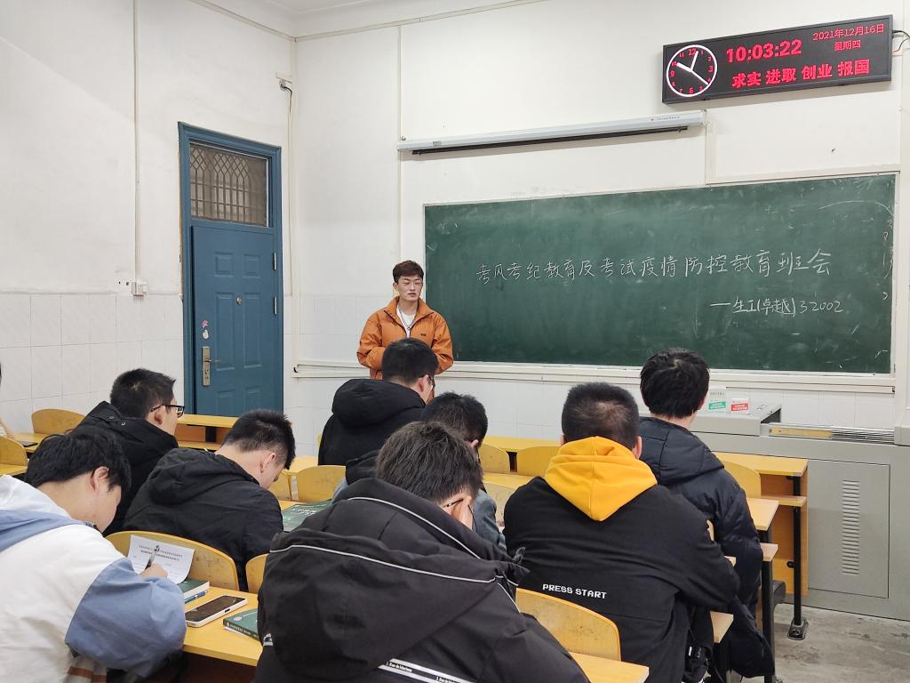 临近大学英语四六级和期末考试,各班班长首先向同学们讲解英语四六级考试的考试时间、考试地点、考试必带品及考试中的规则,同时向同学们宣读了考试纪律参考条目与违纪处理办法,并对此进行了详细解读,告诉同学们应该树立诚信意识,诚信考试,诚实做人。除此之外,班长向大家说明了考试作弊的严重性,强调树立道德之新风,立诚信之根基是当代大学生义不容辞的责任。最后,班长希望同学们树立信心、沉着应考,在复习的同时注意疫情防控问题,预祝大家在四六级考试以及期末考试中取得优异成绩。