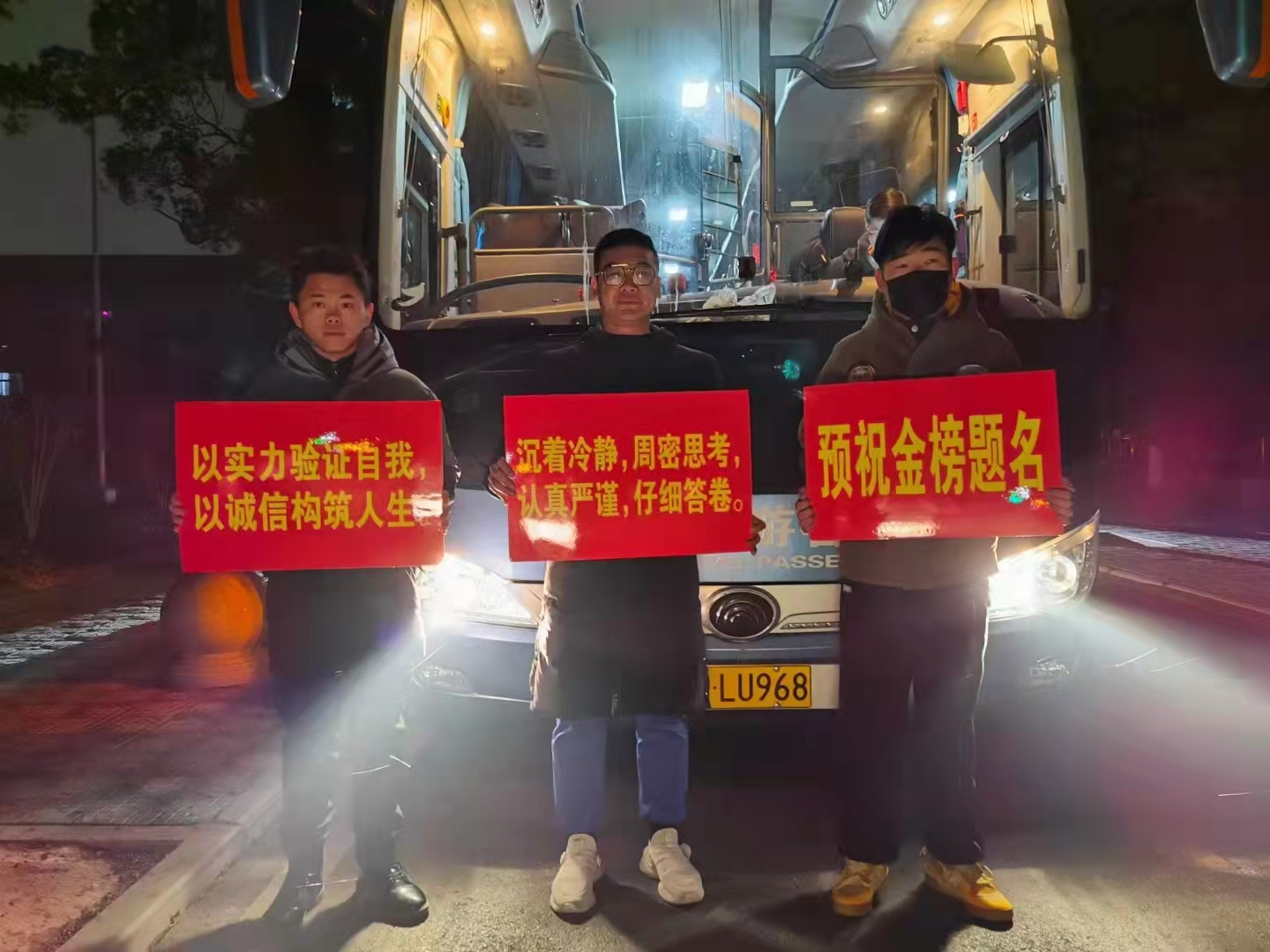 党委副书记汪萍、毕业年级辅导员郭凯、以及低年级学生刘盛茂、魏涛冒着严寒、白雪到现场,为考研学子们送考。