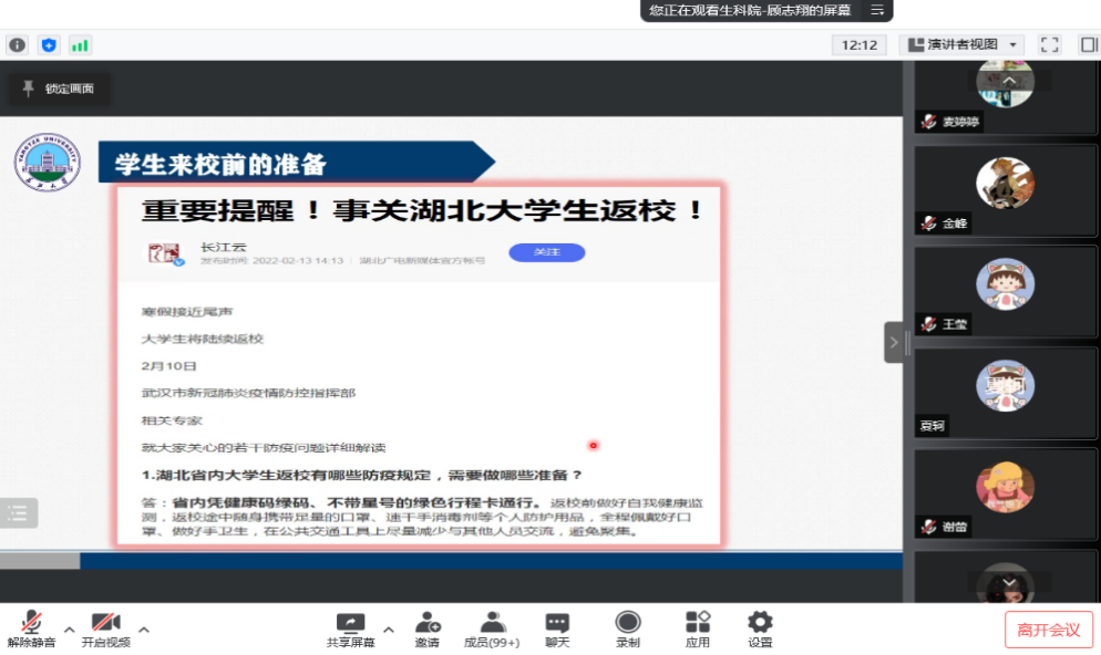 会议上顾志翔老师就研究生开学返校工作做出讲解与强调:1.研究生返校一定要做到连续14天健康打卡。2.先申请,后返校,申请不通过,务必不要返校。3.返校时准备好各自的健康码、行程卡与核酸证明。4.未完成加强针接种的同学务必尽快就近接种。同时老师还提醒同学们返校后做好个人防护,注意个人卫生。