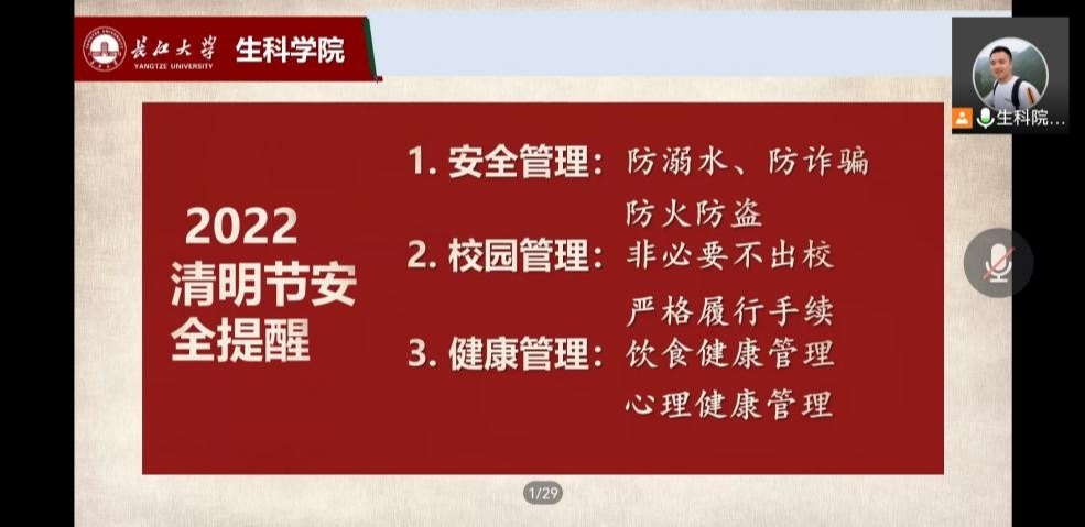 召开21级本科生线上“2022年清明节前安全教育会”,会议由辅导员顾志翔老师主持。