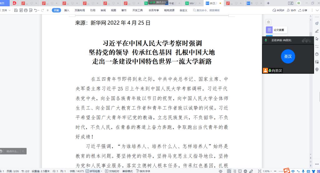 于2022年5月25—5月27日开展研究生政治理论学习。本次政治学习活动以班级班会组织学习、讨论为主,学生业余时间自学等形式为铺,线上、线下学习相结合,使理论学习取得了良好的效果。