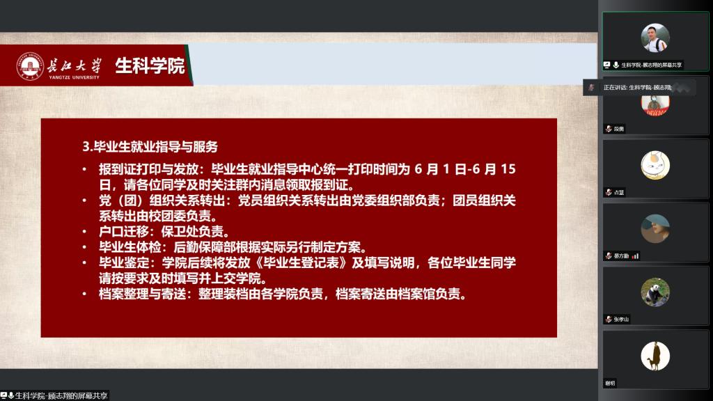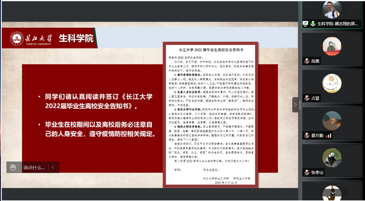 于2022年6月4日开展了硕士毕业生疫情防控、安全离校教育主题班会。本次会议由党委副书记汪萍主持,研究生辅导员顾志翔及全体2022届研究生参加。