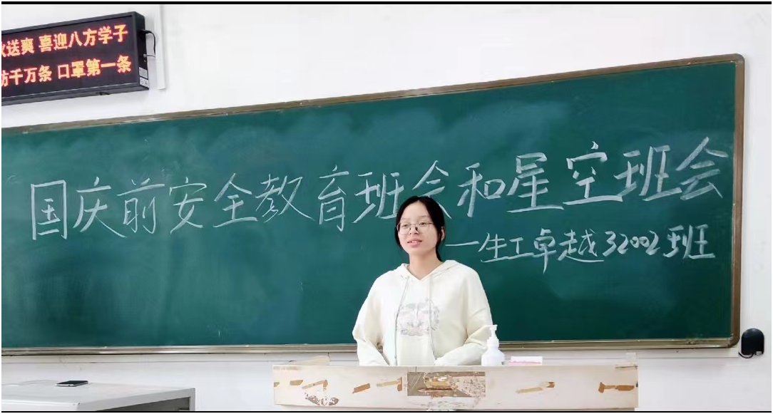 组织31个班级分班召开“安全庆国庆,喜迎二十大”安全主题班会,会议由各班安全员主持,全体同学参加。