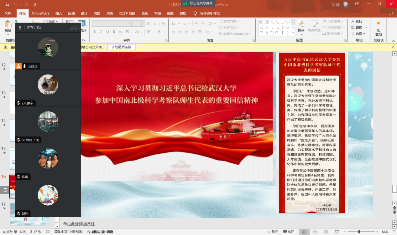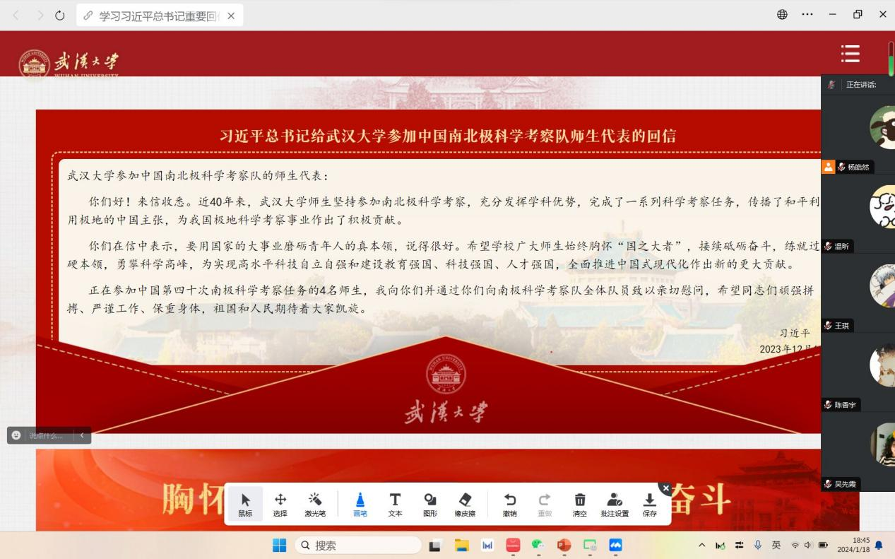 全院师生热议习近平总书记给武汉大学参加中国南北极科学考察队师生代表的回信精神。习近平总书记强调广大师生要始终胸怀“国之大者”,接续砥砺奋斗练就过硬本领,勇攀科学高峰。