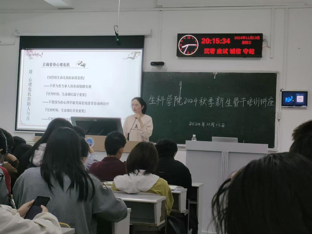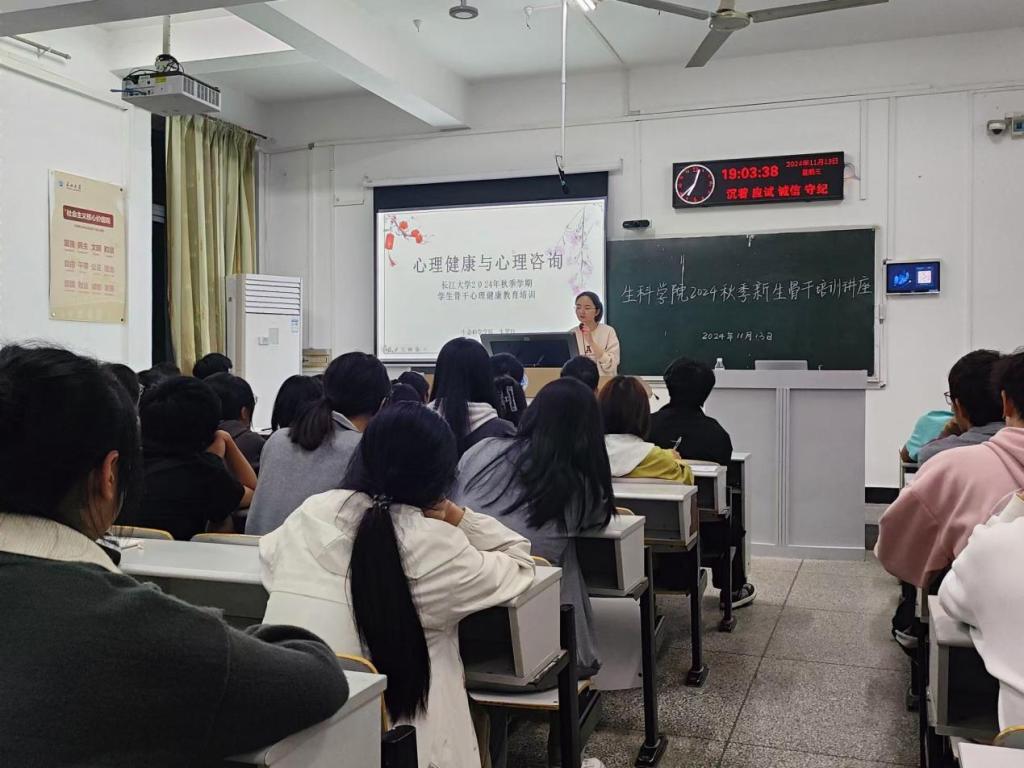 于11月13日晚在西校区7教204室开展秋季学期学生骨干心理健康教育培训。本次培训由心理专干朱翠玲老师主讲,本、研各班级的班长、团支部书记、安全委员、心育委员、寝室长以及学生会心育部人员等120余人。