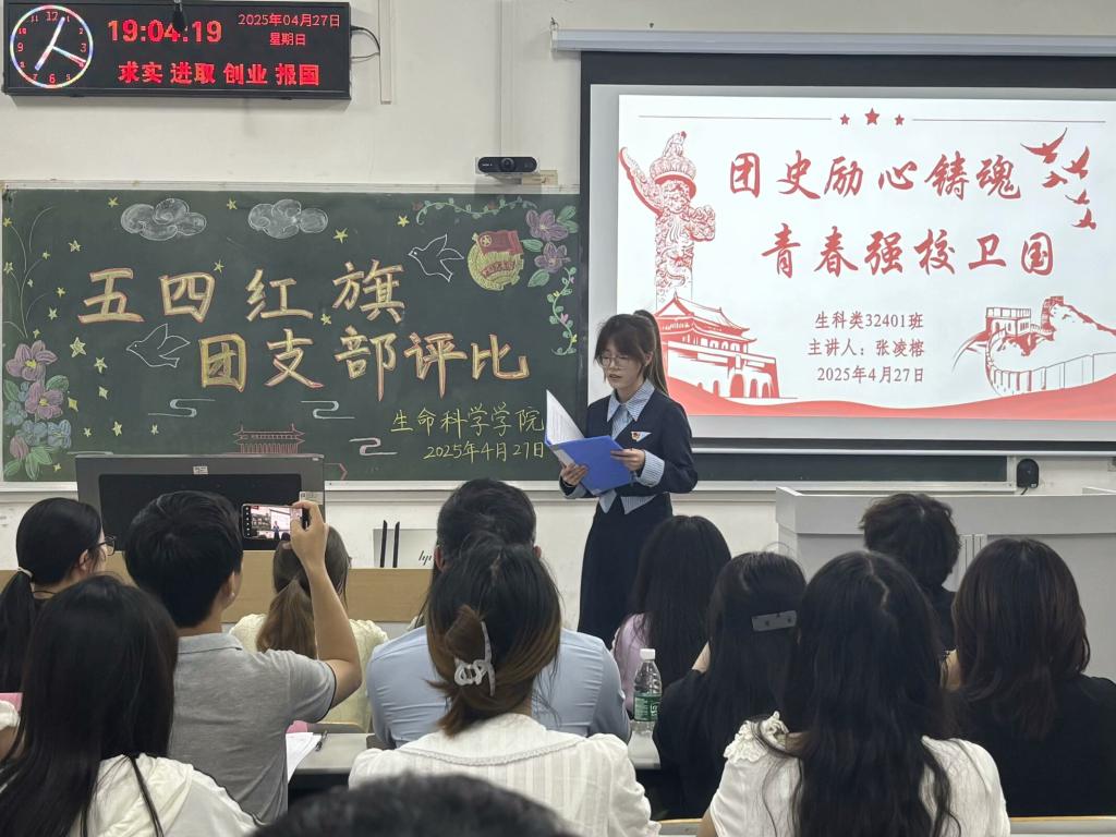 生科类32401团支部“团史励心铸魂,青春强校卫国”主题团会以抗议巴黎和会外交失败情景剧开场,将师生瞬间拉回百年前的五四运动。团会通过知识竞答、听歌识曲等形式学习团史。谭佳怡同学以演讲的形式讲述总体国家安全观,引导同学们保守国家秘密,争当国家安全守卫者。团会中,同学们还围绕助力学校“双一流”建设展开探讨,学习校史校情,增强爱校荣校使命感。