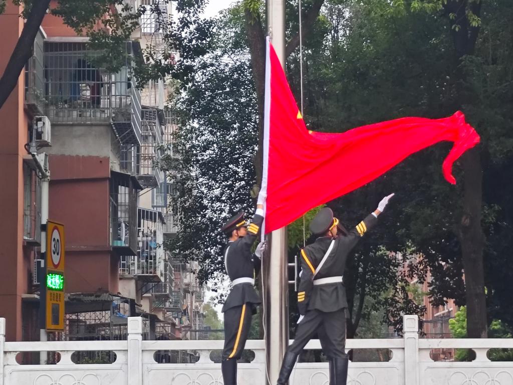 上午7点整,仪式在庄严的口令中拉开序幕。国旗护卫队的队员们迈着铿锵有力的步伐,护送五星红旗缓缓走向升旗台。在全校师生的注目下,鲜艳的五星红旗伴随着激昂的《义勇军进行曲》冉冉升起,飘扬在校园上空。全体师生肃立致敬,高唱国歌,爱国之情在每个人心中激荡。