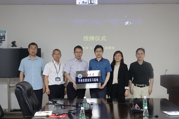 在湖北省绣林玉液酒业有限公司,蔡哲斌一行与该公司党委书记贺汉兵、总经理王大健、人力资源部部长代红等领导开展交流座谈,并进行毕业生就业实习基地签约及授牌。
