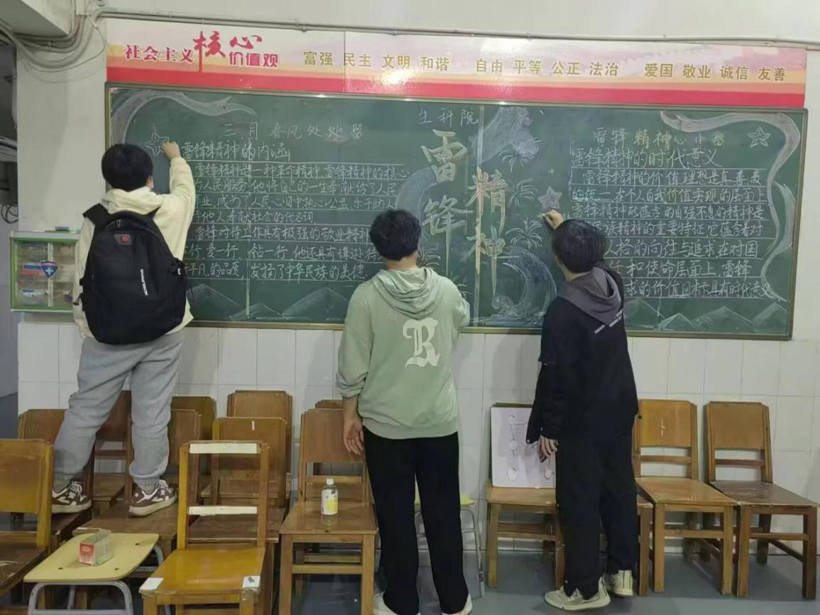 3月18日至19日,学院在河滨公寓组织13名爱好美术与书画的志愿者以“雷锋精神”为主题开展黑板报绘制活动,吸引了众多学生的驻足关注。通过黑板报这一传统别致的形式,将雷锋精神融入校园,也丰富了校园文化生活。