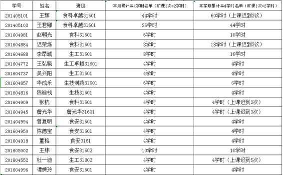 课堂考勤实施办法》,经学工办研究决定,对本月累计旷课4学时以上,迟到2次及以上的同学予以通报批评: