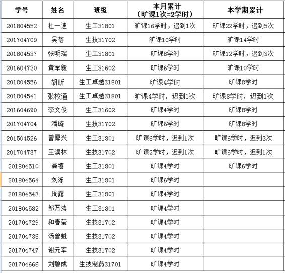 课堂考勤实施办法》,经学工办研究决定,对本月累计旷课4学时及以上、迟到2次及以上同学予以通报批评: